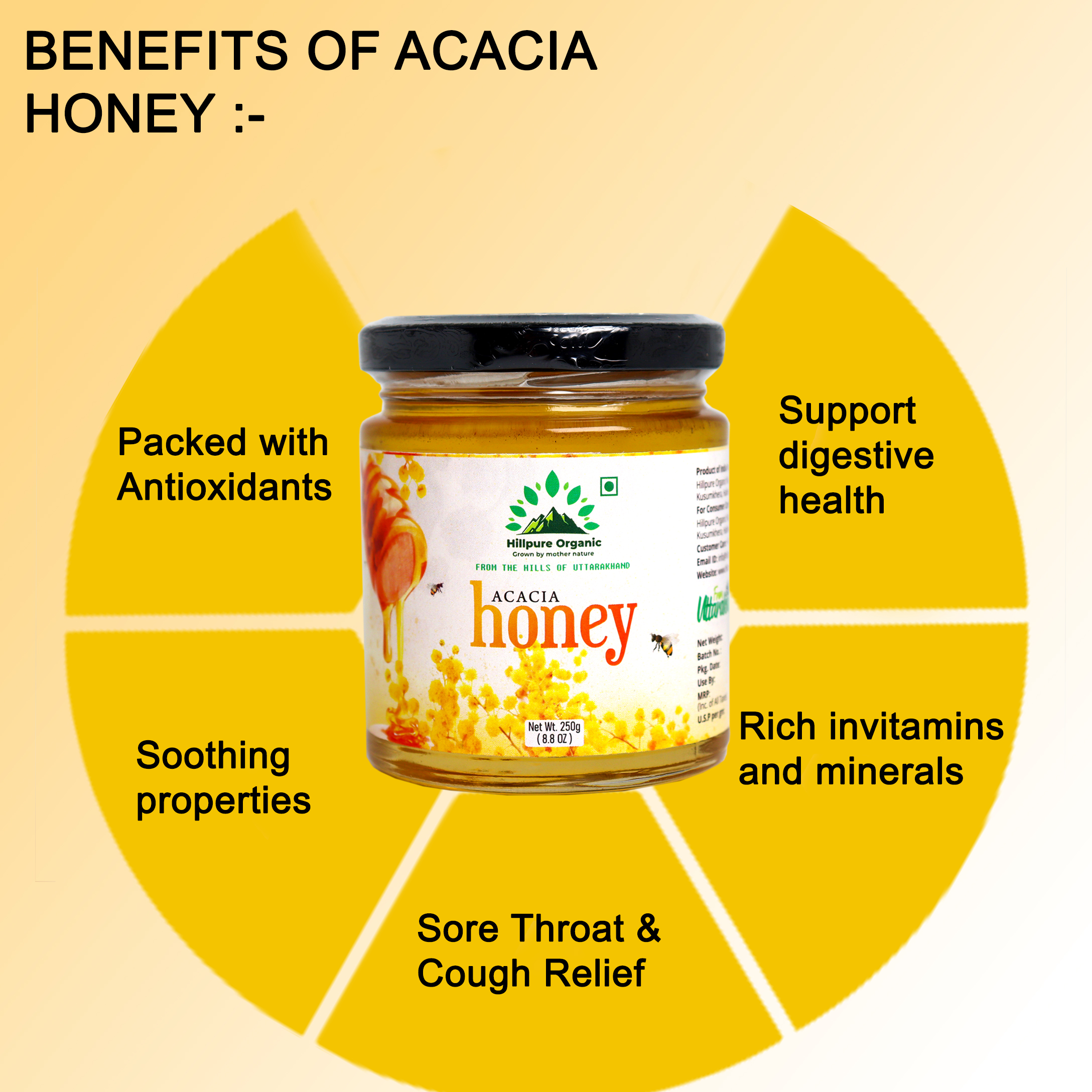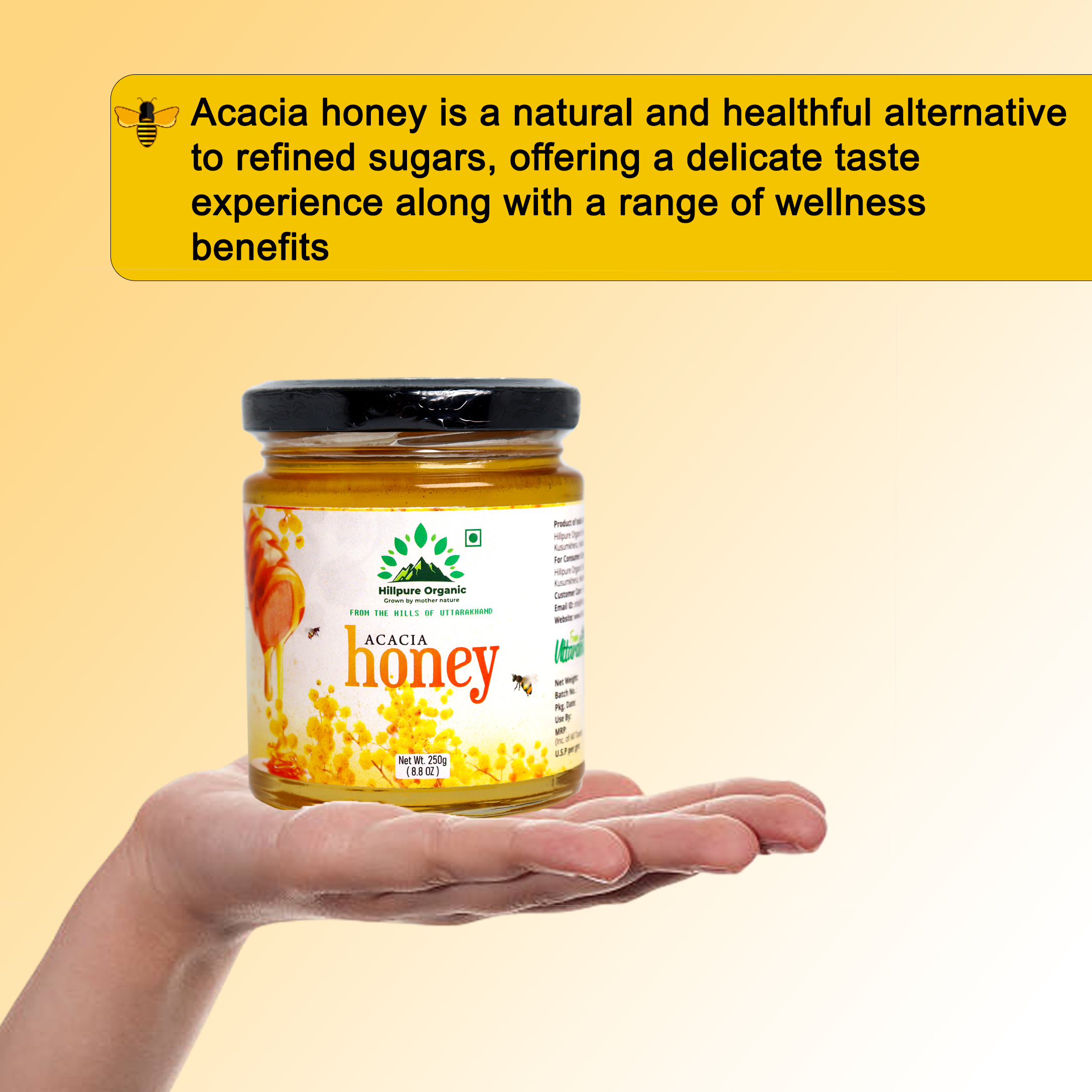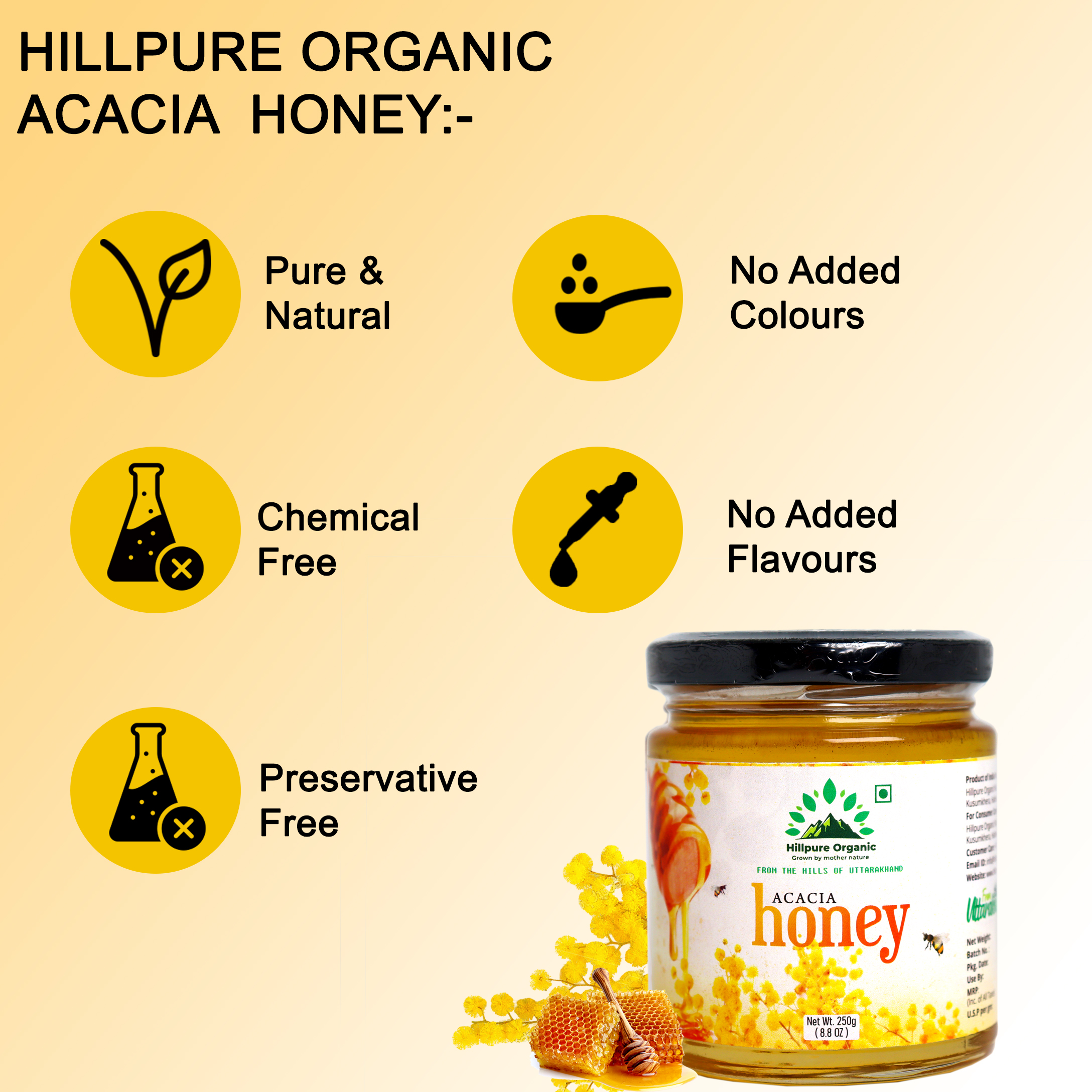 Hillpure Organic Grown by mother nature Natural Acacia Honey | 100% Pure & Raw | Light Golden Honey | No Added Sugar | Unprocessed & Natural Sweetener, Breakfast and Everyday Use