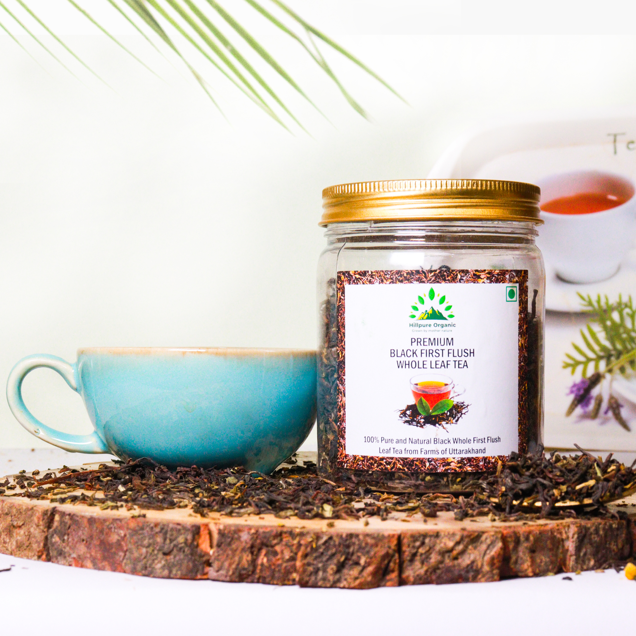 PREMIUM BLACK WHOLE FIRST FLUSH LEAF TEA Hillpure Organic premium whole leaf tea is grown in Uttarakhand using traditional farming methods, without the use of any chemicals or pesticides. We hand pick the whole leaves, dry them naturally and pack the whole leaves for tea. First flush refers to the first picking of a tea plant’s spring or late winter yield. First Flush black tea, which is picked early in the season,is frequently referred to as the Champagne of teas and is the most premium. When tea is grown at a high altitude, it absorbs the wonderful terroir of the Himalayan region, giving it a distinctive and recognisable flavour. Beautifully light tea that is pure and delicate like the moonlight, as well as a sensory festival, with extra antioxidant advantages for better health.