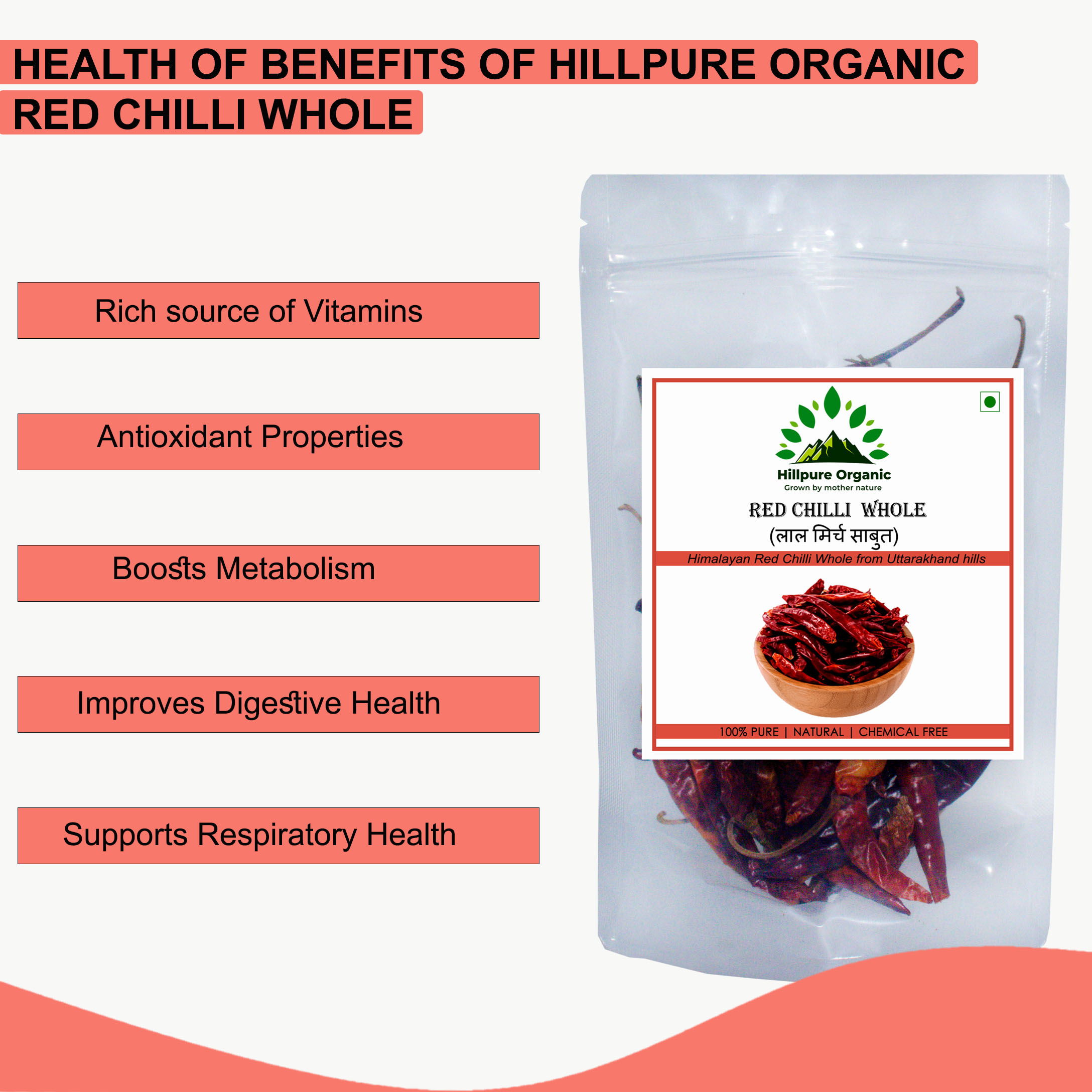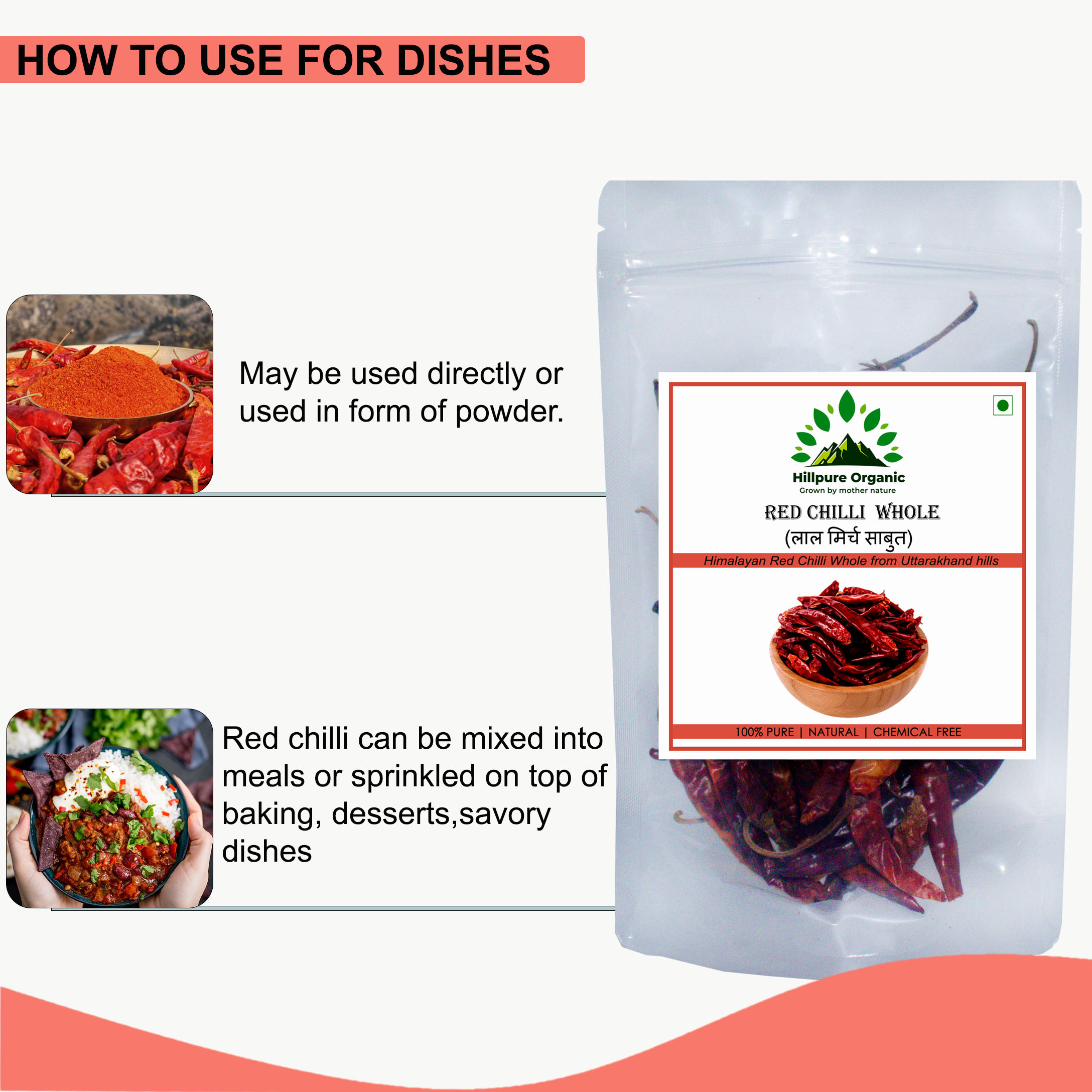 Hillpure Organic Red Chilli are bought from the hills of Uttarakhand with its natural goodness. Its 100% pure with no chemicals, no artificial flower, and processed naturally with zero preservatives. Directly collected from farmers, cleansed and packed.